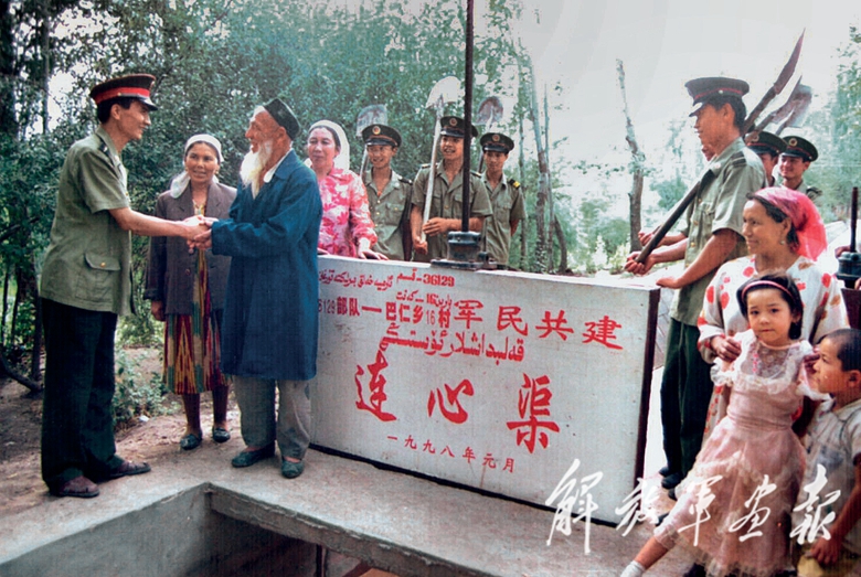 1996年,該團官兵經(jīng)過3年多的努力,修筑了一條2公里長的灌溉主干渠,輻射延伸幾十條支渠,總長達15公里,使村里的土地灌溉面積從不足200畝增加到4000畝。年年吃返銷糧的十六村群眾,第一次向國家交售了余糧。鄉(xiāng)親們把這條水渠親切地稱為“連心渠”。