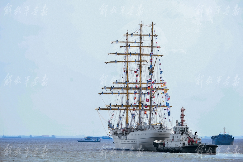 中方官兵列隊歡迎印度尼西亞海軍“畢瑪蘇吉”號風帆訓練艦訪滬。