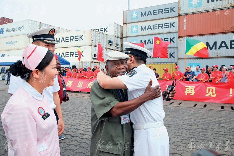 姆福圖與和平方舟醫(yī)院船官兵擁抱告別。