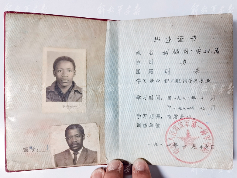 1970年,剛滿20歲的姆福圖通過層層選拔,成為剛果(布)軍隊第一批赴華留學生之一?!爱敃r,中國非常重視我們這批學生,多位老一輩黨和國家領導人親切接見我們,照片就是在那時拍攝的。”姆福圖說著,又從信封里拿出他1973年第二次來中國留學時的“外國留學生畢業(yè)證書”和“學習成績單”。