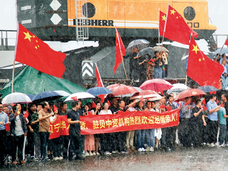 當地時間2024年10月17日,和平方舟醫(yī)院船抵達貝寧科托努港。圖為華人華僑、中資機構員工代表在雨中歡迎和平方舟醫(yī)院船到訪。(攝影/記者 曹春耀)
