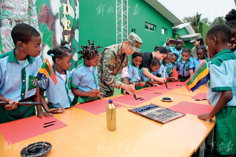 當地時間2024年9月28日,和平方舟醫(yī)院船訪問加蓬期間,任務官兵代表在當地綠貝雷學校教小學生寫毛筆字。(攝影/劉志磊)