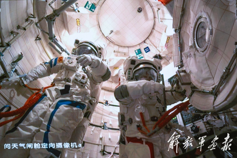 3月21日在北京航天飛行控制中心拍攝的神舟十九號航天員蔡旭哲(右)、宋令東在氣閘艙內(nèi)做出艙準(zhǔn)備的畫面。(攝影/新華社記者 李明剛)