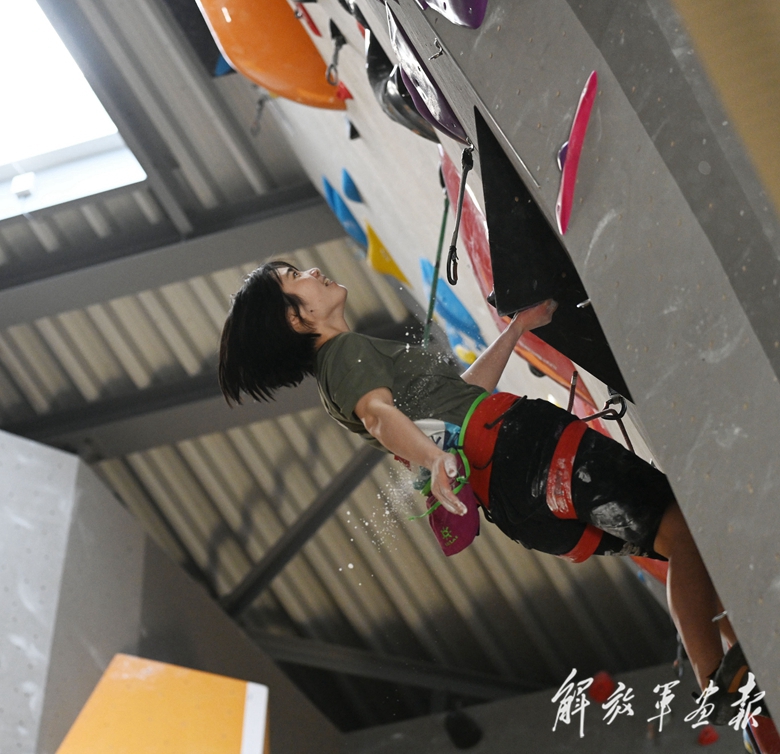 當(dāng)?shù)貢r間3月24日,我軍選手汪漫進行難度攀巖比賽。