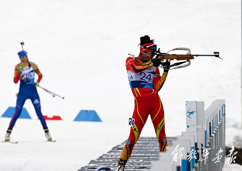 當(dāng)?shù)貢r間3月25日,我軍選手曲穎(右)參加冬季兩項比賽。