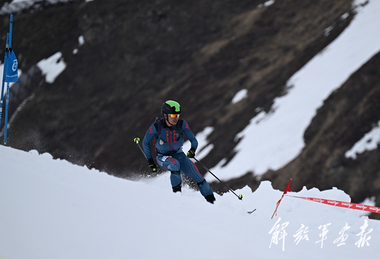 當(dāng)?shù)貢r間3月28日,我軍選手朱磊在滑雪登山混合接力比賽中。