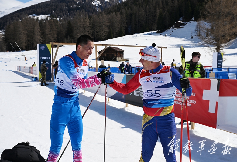 當(dāng)?shù)貢r間3月25日,我軍選手詹昭偉(左)在越野滑雪項目比賽結(jié)束后,與外軍隊員交流。