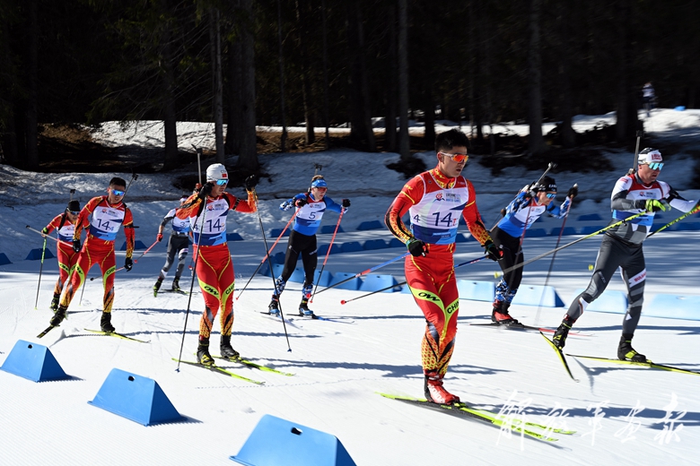 當(dāng)?shù)貢r間3月28日,我軍選手邰政文在滑雪定向男女混合接力比賽中。