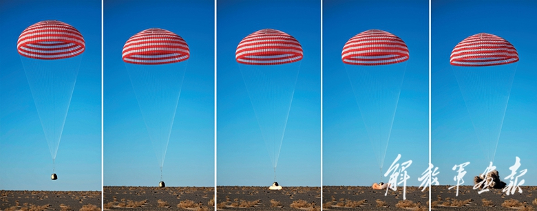 4月30日,神舟十七號(hào)載人飛船返回艙在東風(fēng)著陸場成功著陸(拼版照片)。