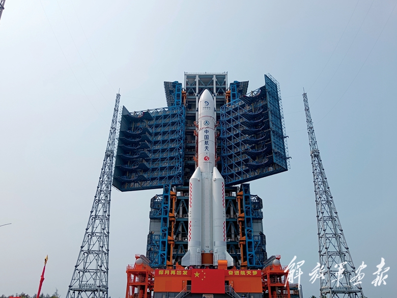 4月27日,嫦娥六號(hào)探測(cè)器和長征五號(hào)遙八運(yùn)載火箭器箭組合體垂直轉(zhuǎn)運(yùn)至發(fā)射區(qū)。(攝影/黃國暢)