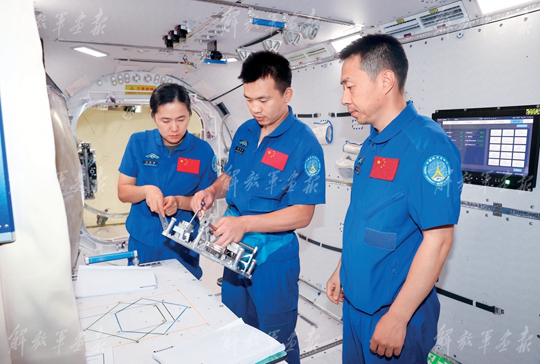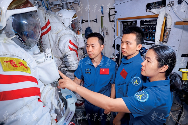 神舟十九號(hào)航天員乘組(從左至右:王浩澤、宋令東、蔡旭哲)進(jìn)行核心艙操作訓(xùn)練。(攝影/徐 部)