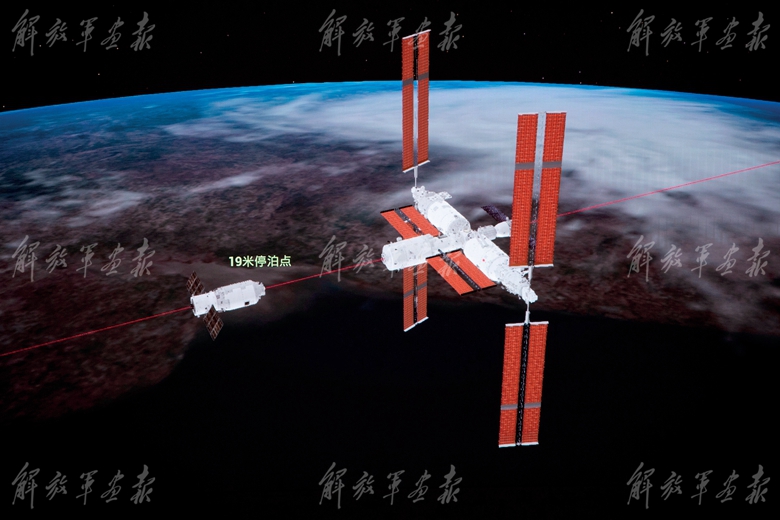 11月16日在北京航天飛行控制中心拍攝的天舟八號(hào)貨運(yùn)飛船與空間站組合體完成交會(huì)對(duì)接的畫面。(攝影/韓啟揚(yáng))