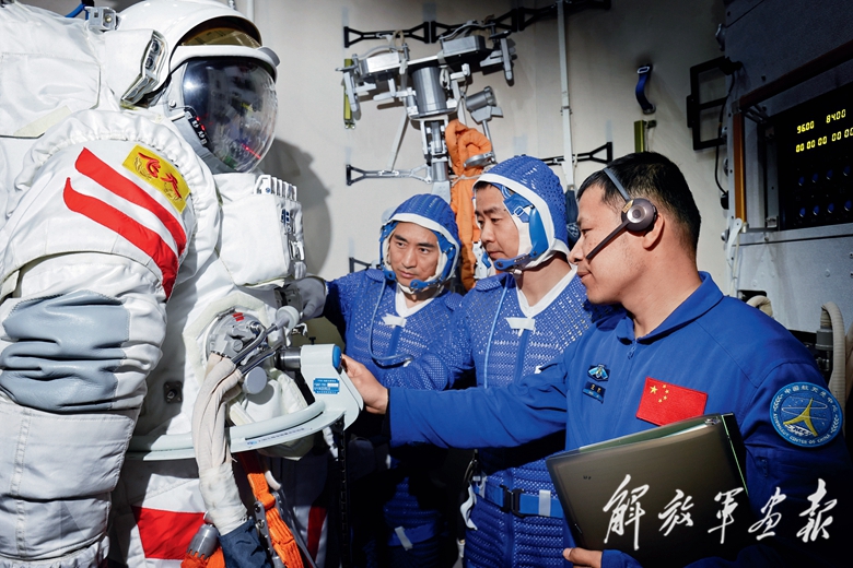 神舟二十號航天員乘組(從左至右:陳中瑞、陳冬、王杰)進(jìn)行出艙程序訓(xùn)練。(攝影/徐 部)