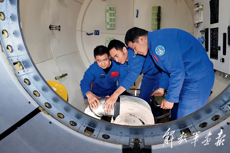 神舟二十號航天員陳冬(左)、陳中瑞(中)、王杰(右)在問天艙模擬艙內(nèi)訓(xùn)練。(攝影/徐 部)