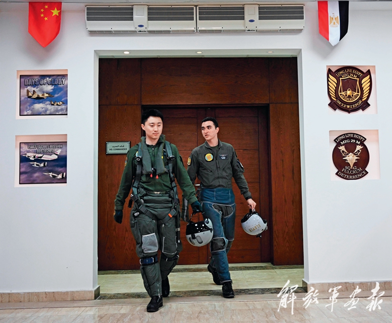 當?shù)貢r間5月1日,埃及空軍某基地,參加中?!拔拿髦?2025”空軍聯(lián)合訓練的中埃雙方飛行員并肩前行。