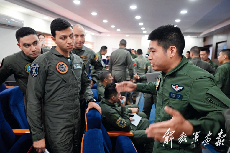 當?shù)貢r間4月18日,埃及空軍某基地,中國空軍飛行員(右一)與埃及空軍飛行員互相交流。