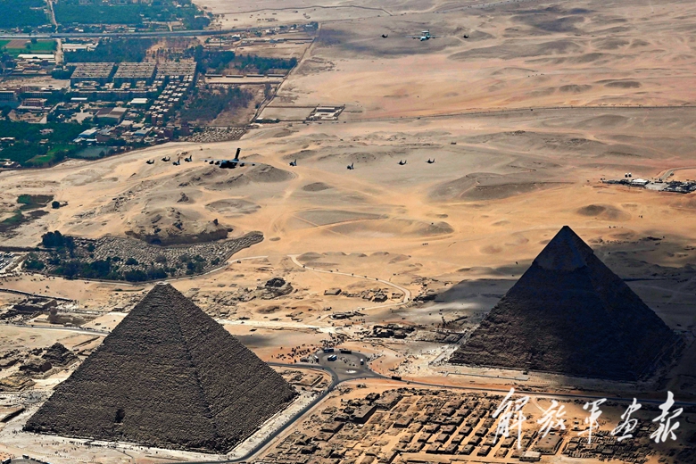 當?shù)貢r間5月1日,埃及開羅,參加中?!拔拿髦?2025”空軍聯(lián)合訓練的中埃雙方戰(zhàn)機超低空編隊飛越金字塔。(攝影/郝 煒)