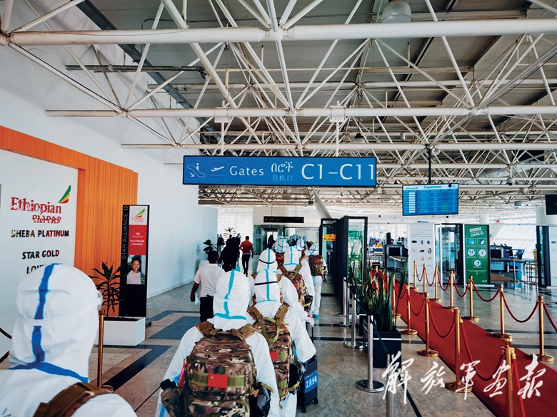 飛機進入非洲大陸上空時,已近清晨。忽然間,朝陽照亮了機艙。透過厚厚的護目鏡,幾個來回穿梭忙碌的身影在官兵眼前逐漸變得清晰:逐個檢查隊員防護裝備的軍醫(yī)李小龍、不斷提醒大家注意乘機安全要求的中隊長蘭崇暉、全程負(fù)責(zé)與機組人員溝通行程及注意事項的外事副大隊長高山和3位翻譯人員……厚重的防護服下,滿溢著溫暖和力量。