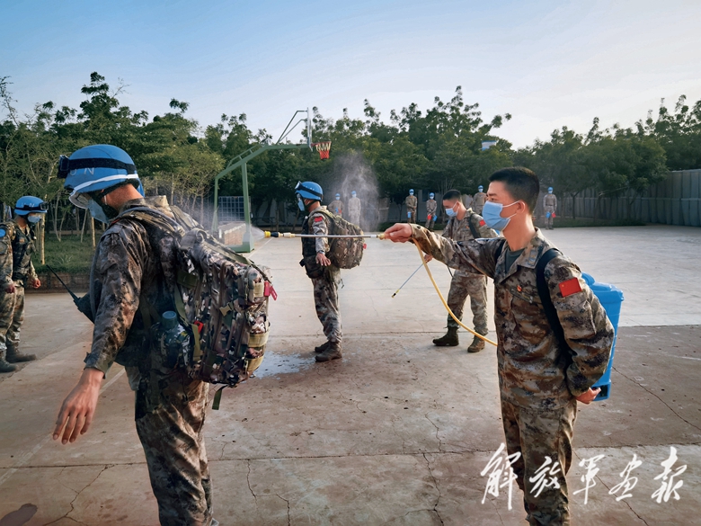 乘坐擺渡中巴車向營區(qū)機動途中,目光所及,五星紅旗迎風(fēng)飄揚,親切感、自豪感頓時涌上官兵心頭。抵達中國維和營地后,大家開始進行逐人逐箱逐車洗消工作,對隔離營區(qū)設(shè)施進行徹底消殺,為接下來為期2周的醫(yī)學(xué)隔離觀察做好準(zhǔn)備。