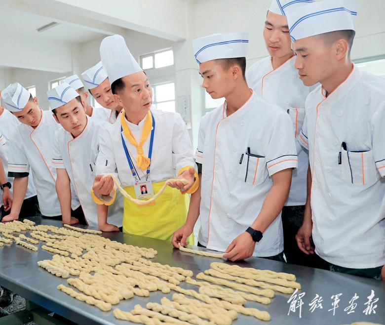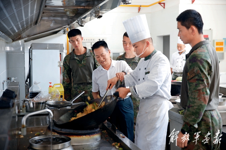 八一建軍節(jié)前夕,在新疆軍區(qū)某部,一位身著廚師服的“大廚”在灶臺前為官兵進行烹飪技能教學示范。他年過花甲,但依舊精神矍鑠,煎炒烹炸動作如行云流水,沒多大一會兒,一道道色香味俱全的菜肴便像變魔術一樣擺在官兵面前,引來大家嘖嘖稱贊。