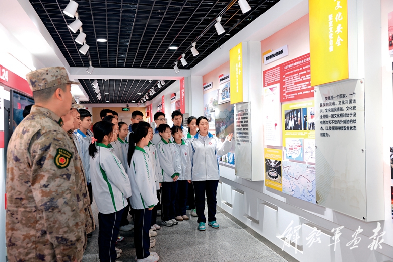組織駐地學校師生代表到國家安全主題公園參觀見學,官兵為大家普及國家安全知識。