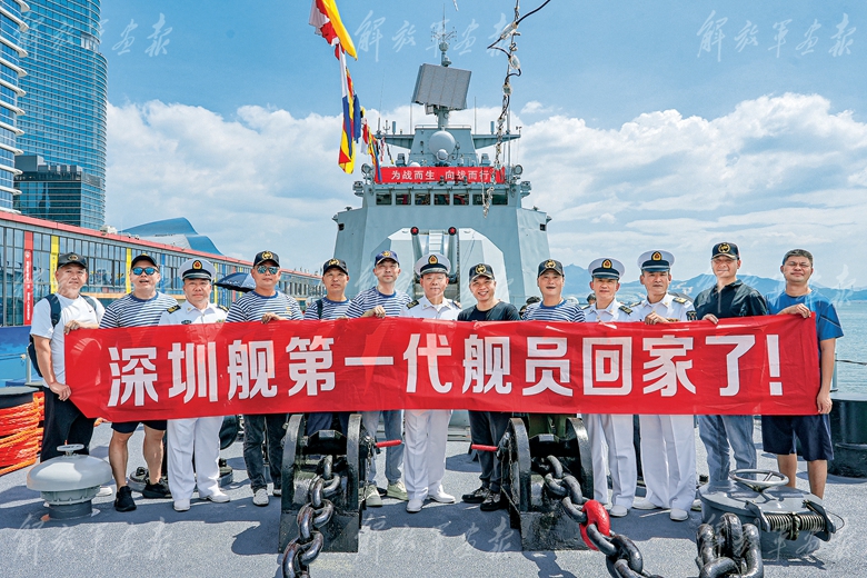 深圳艦第一代艦員登上深圳艦合影留念。