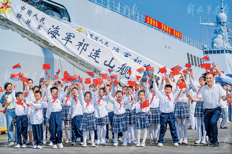 湛江某軍港,人群絡(luò)繹不絕。大家爭相來到祁連山艦前“打卡”留念?!捌钸B山艦的‘肚子’好大,可以容納好多裝甲車!太威武了!”登艦參觀的小學(xué)生們興奮之情溢于言表。