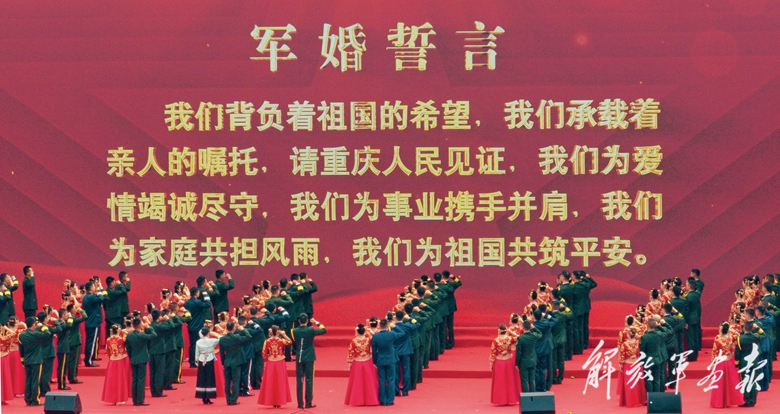 “我們?yōu)閻矍榻哒\盡守,我們?yōu)槭聵I(yè)攜手并肩,我們?yōu)榧彝ス矒?dān)風(fēng)雨,我們?yōu)樽鎳仓桨??!卑賹π氯饲f嚴(yán)舉起右手,齊聲誦讀軍婚誓詞,婚禮儀式現(xiàn)場氣氛達(dá)到高潮。