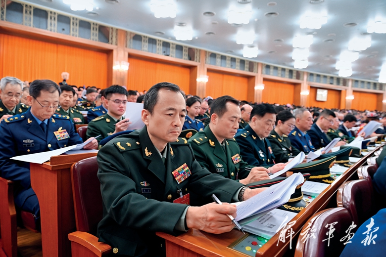 3月5日,十四屆全國(guó)人大二次會(huì)議在北京人民大會(huì)堂開幕。圖為軍隊(duì)人大代表認(rèn)真聽取政府工作報(bào)告。(攝影/馬增科)