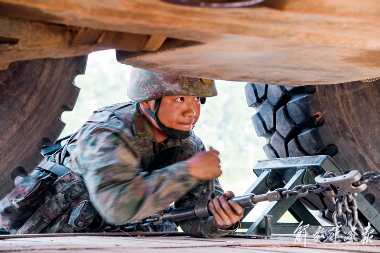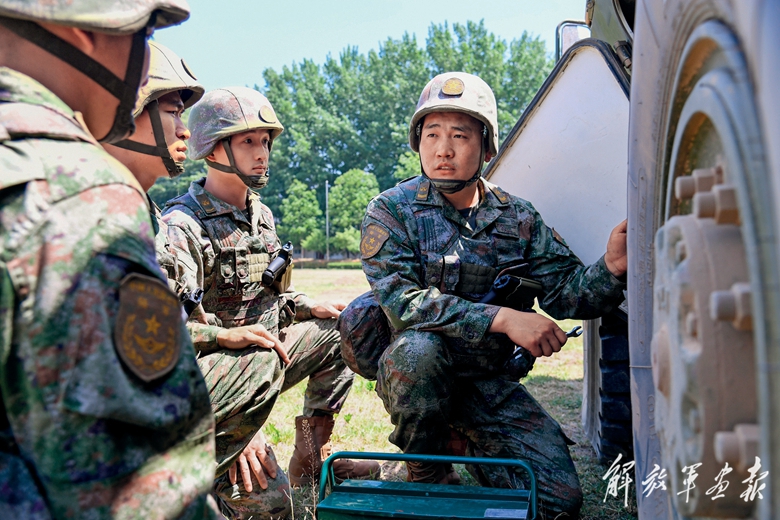 技術(shù)骨干(右一)向戰(zhàn)友傳授裝備維修技能。