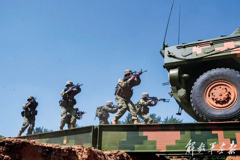 進攻戰(zhàn)斗訓(xùn)練中,官兵快速下車。