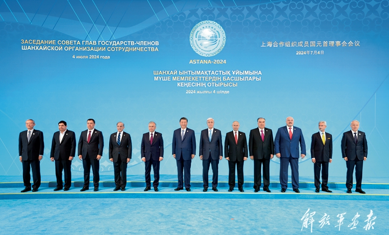 當(dāng)?shù)貢r(shí)間7月4日上午,國(guó)家主席習(xí)近平在阿斯塔納獨(dú)立宮出席上海合作組織成員國(guó)元首理事會(huì)第二十四次會(huì)議。這是習(xí)近平同上海合作組織成員國(guó)領(lǐng)導(dǎo)人集體合影。 攝影/新華社記者 鞠 鵬