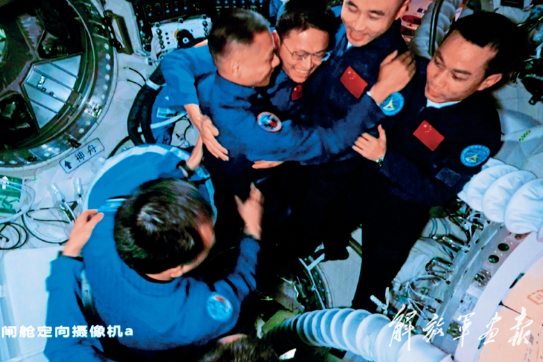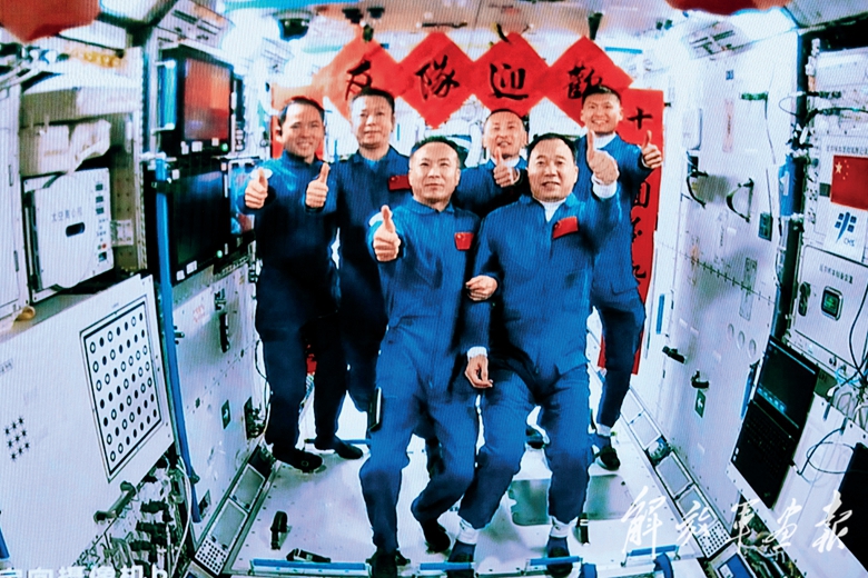 2023年5月30日,神舟十五號航天員乘組與神舟十六號航天員乘組在太空勝利“會師”。(攝影/新華社記者 李 杰)