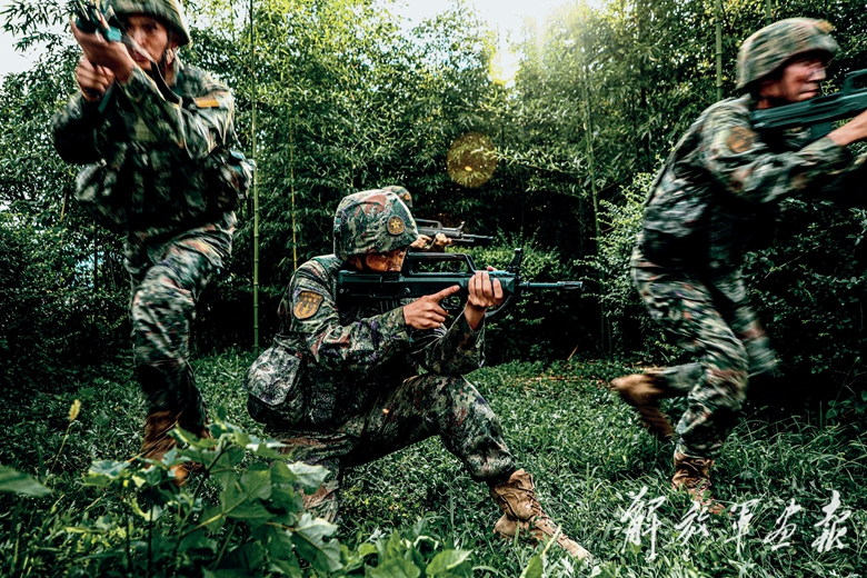 火箭軍某部開展警衛(wèi)專業(yè)比武考核。圖為官兵交替掩護,快速通過叢林地帶。(攝影/潘一烽)