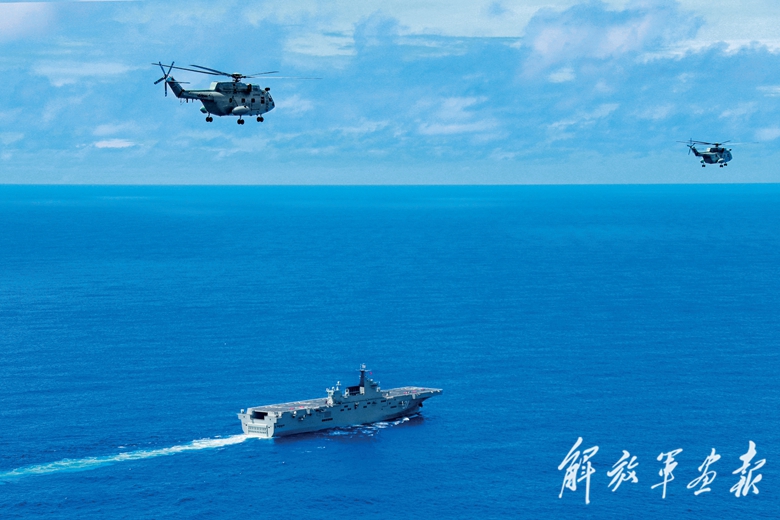 海軍某登陸艦支隊開展全要素實戰(zhàn)化訓練。圖為艦載機編隊向目標空域飛行。(攝影/喬晨曦)