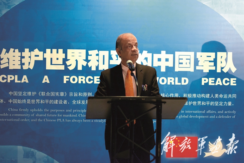 毛乃國(guó)在致辭中表示,中國(guó)軍隊(duì)是維護(hù)世界和平的堅(jiān)定力量,已參加24項(xiàng)聯(lián)合國(guó)維和行動(dòng),派出官兵3.9萬余人次。根據(jù)聯(lián)合國(guó)授權(quán),中國(guó)海軍在亞丁灣已為6600余艘次中外船舶護(hù)航。中國(guó)軍隊(duì)還積極參加國(guó)際災(zāi)難救援和人道主義援助。中國(guó)軍隊(duì)與正義同行、與和平相伴,始終是尊重生命、呵護(hù)安寧的“暖實(shí)力”。