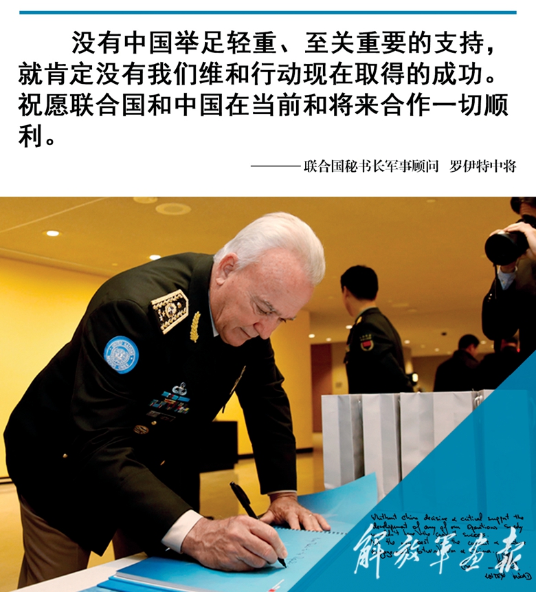 哈雷在致辭中高度評(píng)價(jià)中國(guó)在聯(lián)合國(guó)維和行動(dòng)中發(fā)揮的重要作用,感謝中國(guó)軍隊(duì)對(duì)維和事業(yè)“持續(xù)而廣泛的支持”。他說,中國(guó)既是聯(lián)合國(guó)安理會(huì)常任理事國(guó),又是維和行動(dòng)出兵大國(guó),還是第二大維和出資國(guó)。同時(shí)承擔(dān)這三項(xiàng)光榮責(zé)任的,只有中國(guó)。