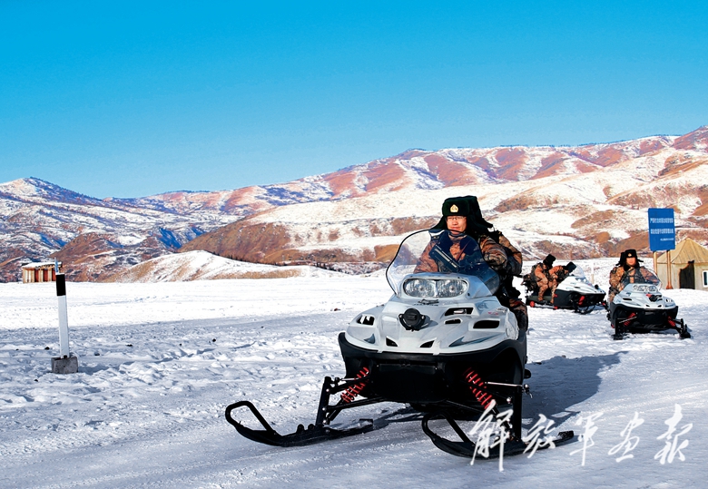 巡邏路上,官兵身著新式邊防巡邏防寒作訓服,駕駛摩托雪橇在遍布冰凌、積雪的道路上前行。