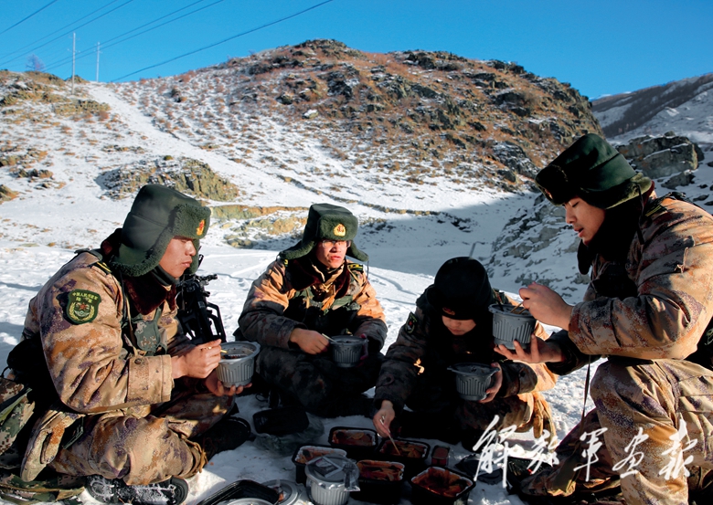 順利完成巡邏任務后,官兵們取出自熱火鍋和新鮮的孔雀菜,一邊準備午飯一邊交流巡邏心得。說話間,熱氣騰騰的自熱火鍋散發(fā)出了香味……