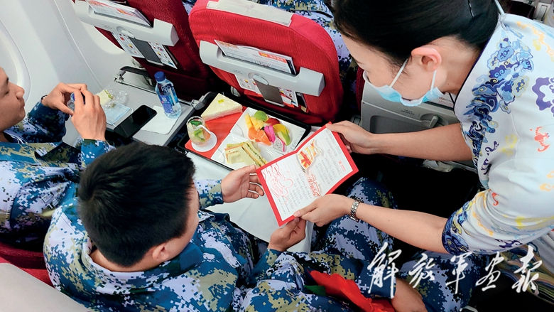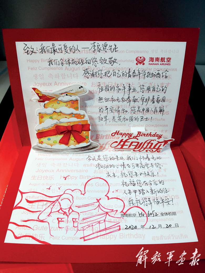 “今天是一名退伍老兵的生日,我們?nèi)w機組人員懷著激動的心情,在萬米高空為他慶生……”飛機進入巡航階段,機組廣播突然響起樊雪松的聲音。原來,今天是老兵李家德的生日,機組專門為他安排了一個特殊的慶祝儀式,提前精心制作了生日賀卡和可口餐食,為李家德送上一份驚喜。