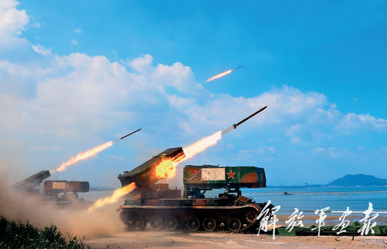 火箭炮分隊(duì)對(duì)海上目標(biāo)進(jìn)行實(shí)彈射擊。