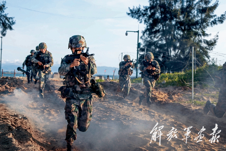 搶灘登陸演習(xí)中,步兵分隊(duì)迅速開(kāi)辟通路。