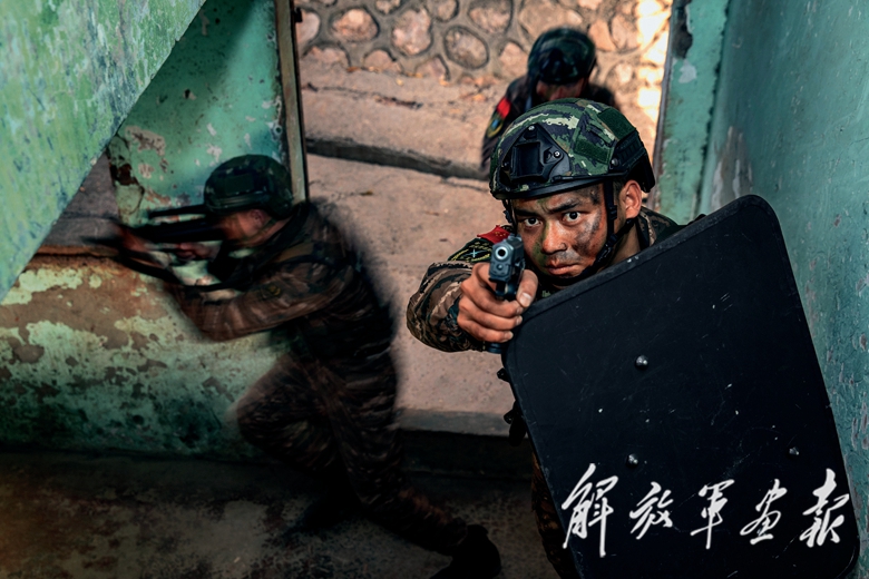 當(dāng)邱健踹開一扇緊閉的房門時(shí),屋內(nèi)隱藏的暴徒突然持刀向他身旁的戰(zhàn)友砍去。千鈞一發(fā)之際,邱健大吼一聲“退后”,迅疾沖上前用盾牌頂開砍刀,一腳將暴徒踢翻在地,與增援的戰(zhàn)友合力將其制伏。