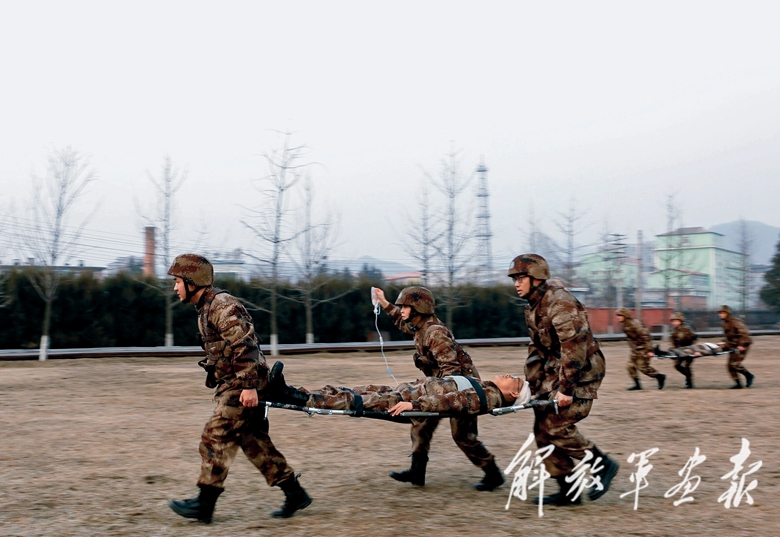 “前方3公里處發(fā)生激戰(zhàn),數(shù)名人員受傷,命令我隊(duì)緊急趕赴救治……”接到命令,各班人員你追我趕奔向目標(biāo)地域,投入到“戰(zhàn)傷救護(hù)”之中。