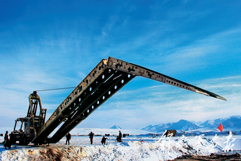 架設(shè)組奔襲至指定地域,標(biāo)定橋軸線、橋礎(chǔ)軸線、倒車線、倒車定位點(diǎn),操作步驟有條不紊、環(huán)環(huán)相扣,隊友間配合默契。橋車到達(dá)架設(shè)點(diǎn)后,保障組迅速就位,展開作業(yè)。10分鐘后,一架20余米長的某新型高原伴隨橋躍然而起,部隊快速通過。
