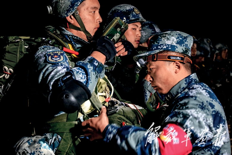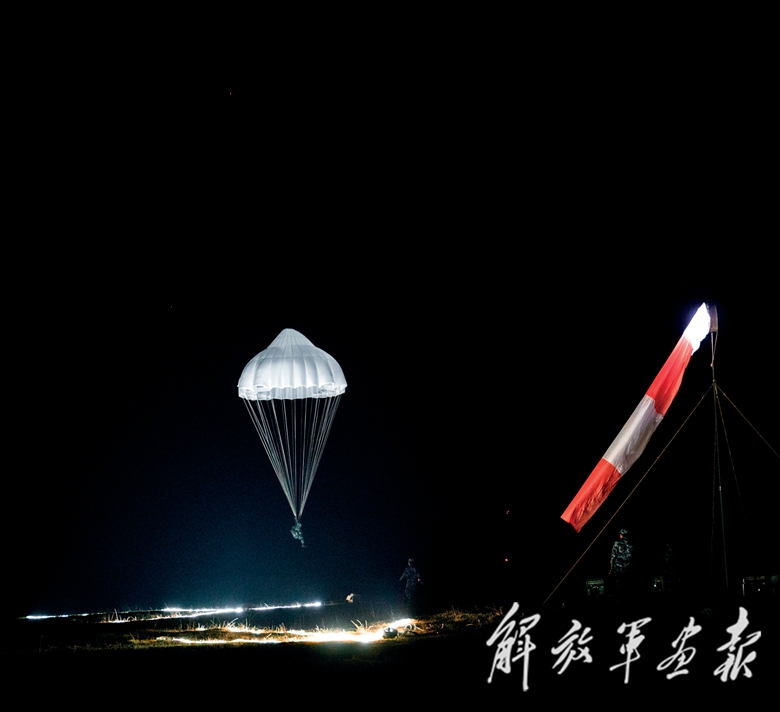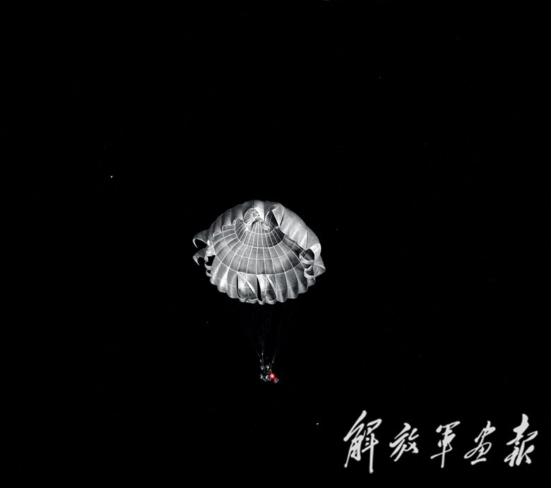 機(jī)艙內(nèi),空降空投技師根據(jù)地面引導(dǎo)分隊回傳的氣象資料提示傘兵離機(jī)操縱注意事項,檢查傘具及武器裝備披掛情況。飛機(jī)很快飛抵預(yù)定空域,艙門打開,艙外漆黑一片。離機(jī)信號發(fā)出后,兩路全副武裝的跳傘員迅速躍出機(jī)艙,朵朵傘花綻放在如墨的夜空中,仿佛點點星光飄向大地……