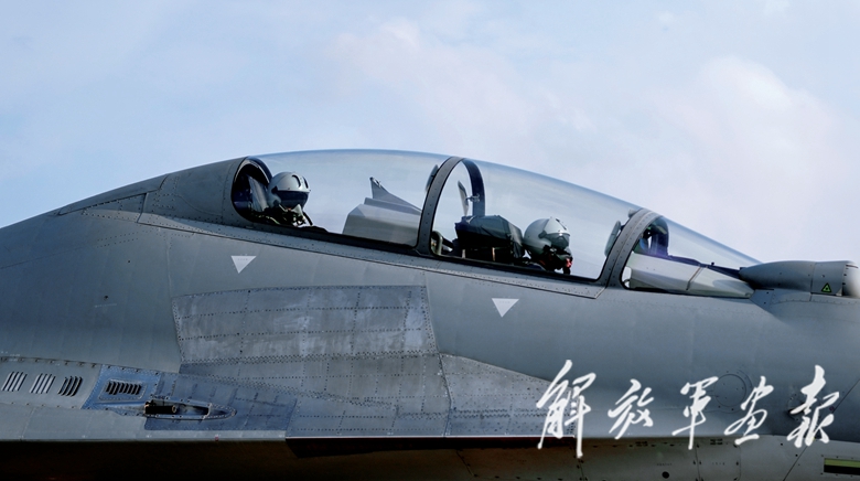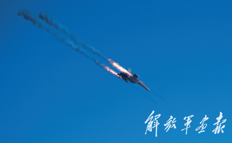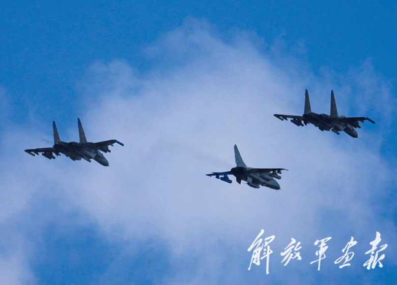 飛行員雷鳴、高科峰駕機(jī)升空后,立即與擔(dān)負(fù)支援掩護(hù)任務(wù)的另一架戰(zhàn)機(jī)組成3機(jī)突擊編隊(duì),準(zhǔn)備突襲“敵”海上目標(biāo)。