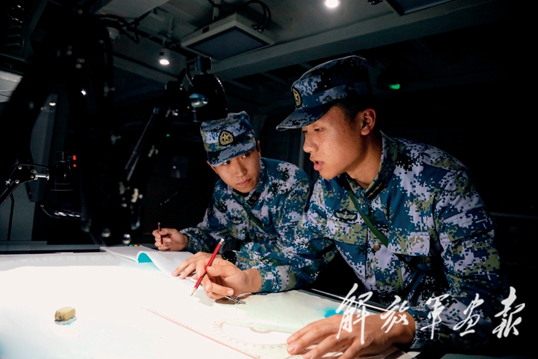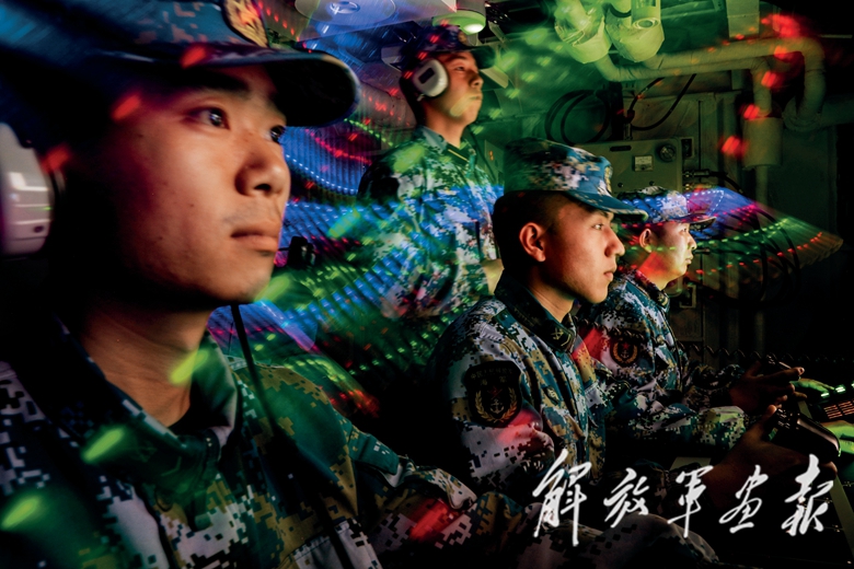 海面硝煙未散,水下險(xiǎn)情又至。“方位××,距離××,發(fā)現(xiàn)金屬回音!”經(jīng)過反復(fù)搜索確認(rèn),我方發(fā)現(xiàn)“敵”潛艇,并及時(shí)通過指揮信息系統(tǒng)通報(bào)編隊(duì)其他艦艇,迅速對其實(shí)施打擊……
