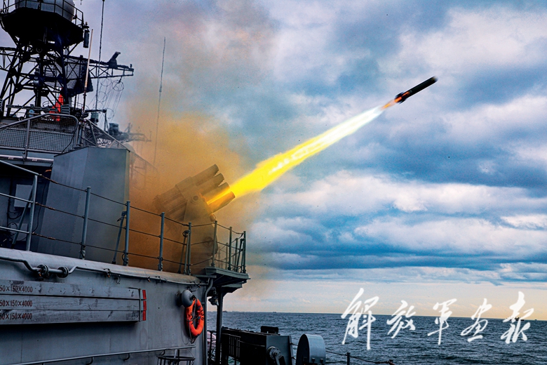 “方位××,發(fā)現(xiàn)末制導(dǎo)雷達(dá)信號?!被鹆Υ驌暨^后,又傳來“敵”導(dǎo)彈來襲通報(bào)。指揮員隨即下達(dá)指令,艙面干擾彈發(fā)射架迅速調(diào)轉(zhuǎn)方向,2枚干擾彈拖著尾焰呼嘯而出,瞬時(shí)凌空開花。