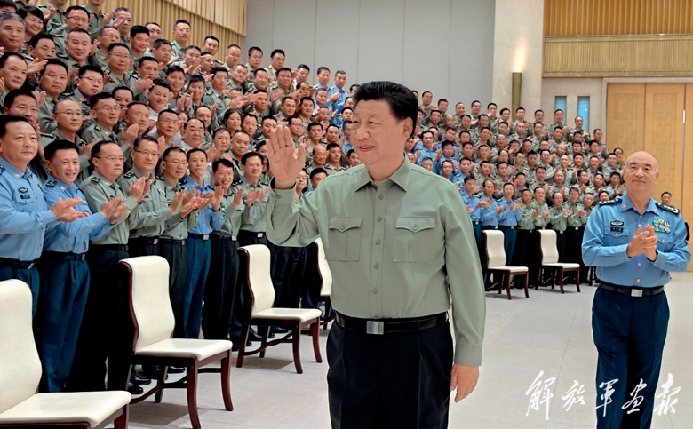 金秋時(shí)節(jié),古城西安天高氣爽,景色宜人。上午10時(shí)30分許,習(xí)近平來到基地營區(qū)。在熱烈的掌聲中,習(xí)近平親切接見駐西安部隊(duì)官兵代表,同大家合影留念。